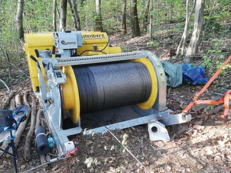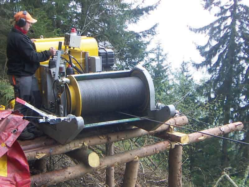 Winches for forestry and civil use, with hydraulic retarders, electronic control, hydraulic control, and winch drum systems with ring for valley work. Power ranges from 100 to 300 hp and pulling forces from 4 to 10 tons. For lines from 1200 to 4000 metres.